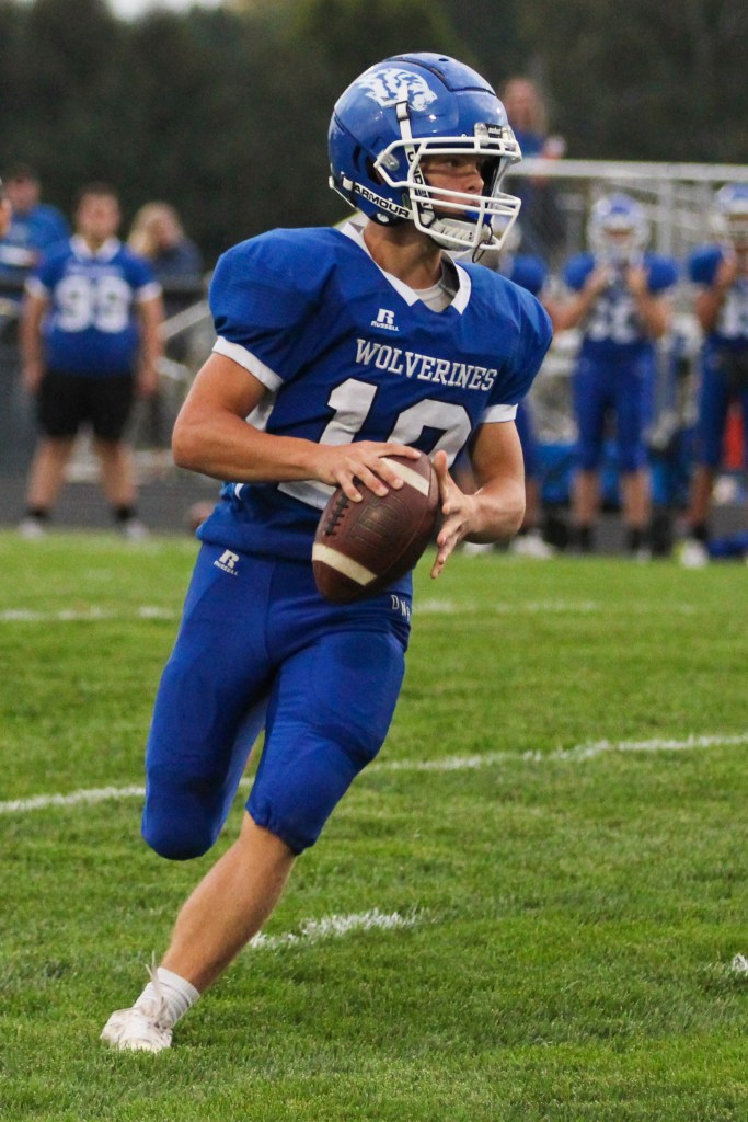 After two runs for no gain, a tackle for loss by Aiden Hook and a D-NH penalty, the Wolverines took a shot at the end zone on 4th-and-goal but Peyton Pokorny’s pass for Aiden Walston was swatted away by Judd Jirovsky for a turnover on downs back to Grundy Center.